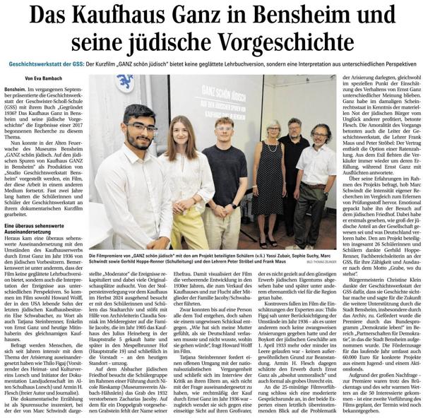 - Eva Bambach: Das Kaufhaus Ganz in Bensheim und seine jüdische Vorgeschichte. Geschichtswerkstatt der GSS: Der Kurzfilm "GANZ schön jüdisch" bietet keine geglättete Lehrbuchversion, sondern eine Interpretation aus unterschiedlichen Perspektiven. In: Bergsträßer Anzeiger vom 24. Juni 2025