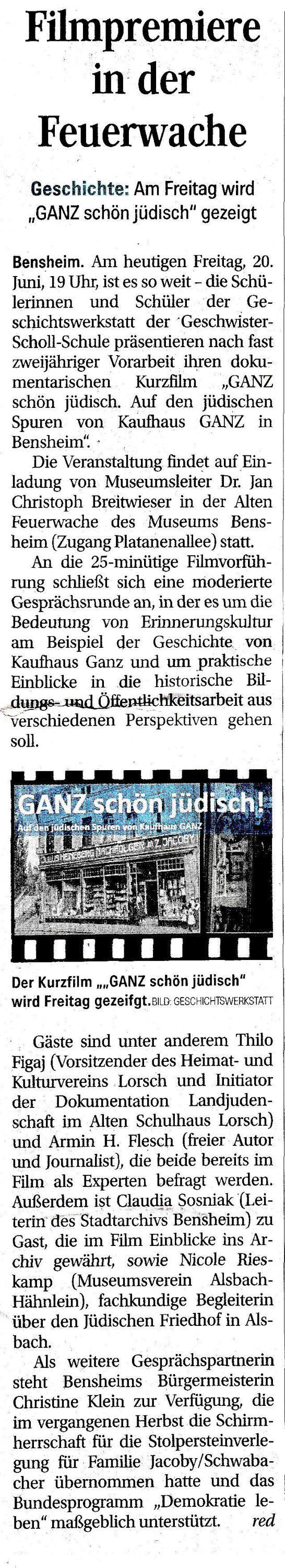 Filmpremiere in der Feuerwache. Geschichte: Am Freitag wird "GANZ schön jüdisch" gezeigt. In: Bergsträßer Anzeiger vom 20. Juni 2025